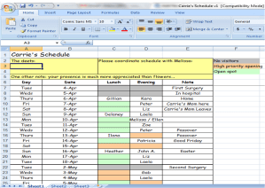 Melissa, I will never ever forget this spreadsheet, it was the spreadsheet of when people could visit…Gillian – the Flinstones vitamins are still one to be laughed at and I remember you were my first walk…sorry if I scared you as I almost fainted in Barnes and Nobles..Delaney and Ellen – you were fabulous in WINY!!!
